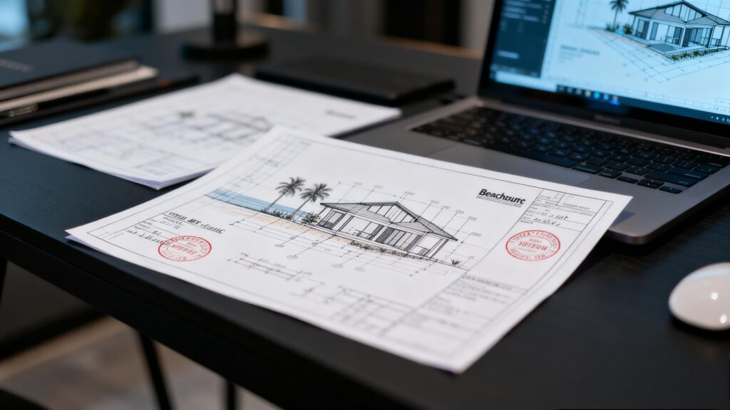 Beachfront builds demand a shoreline-first approach—drainage routing, setbacks, external works, and salt-air detailing
