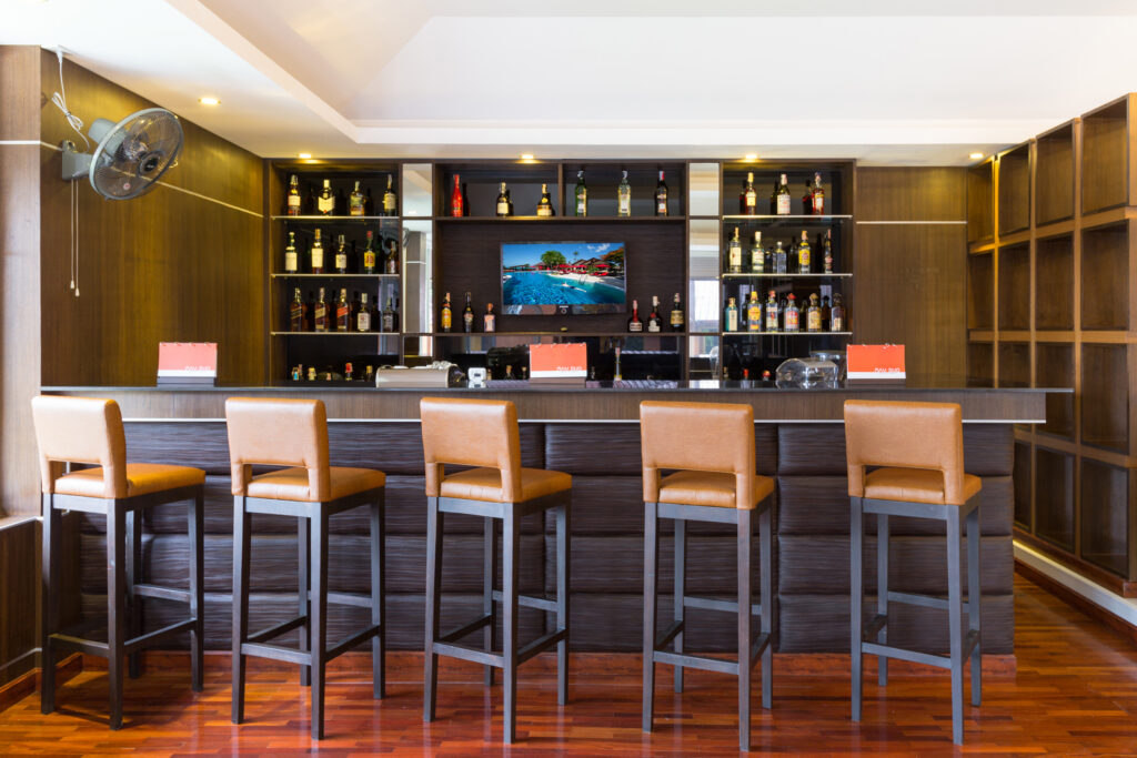 For the bar and lounge areas, we designed and built custom cabinetry using solid tropical hardwoods. Understanding the wear and tear of hospitality environments, we engineered the joinery to be robust and humidity-resistant. The result is a timeless aesthetic that has maintained its structural integrity over a decade of operation.